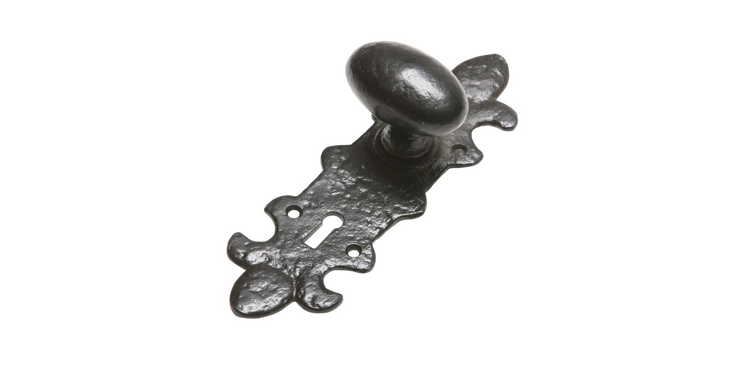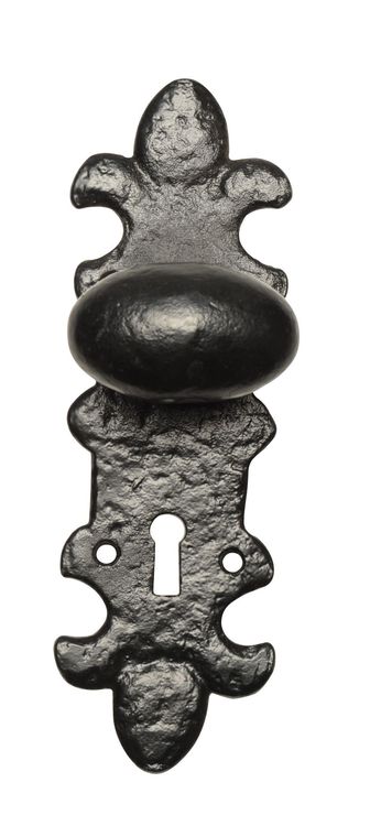 This decorative oval door knob set on unique plate from Kirkpatrick will add interest to any door.