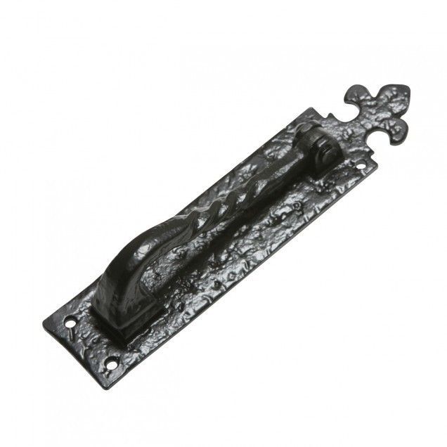 Part of the Kirkpatrick Black Iron Range, this strong and durable door knocker, with Fleur-De-Lys detailing, will be a nice addition to any framed, ledged and braced door.