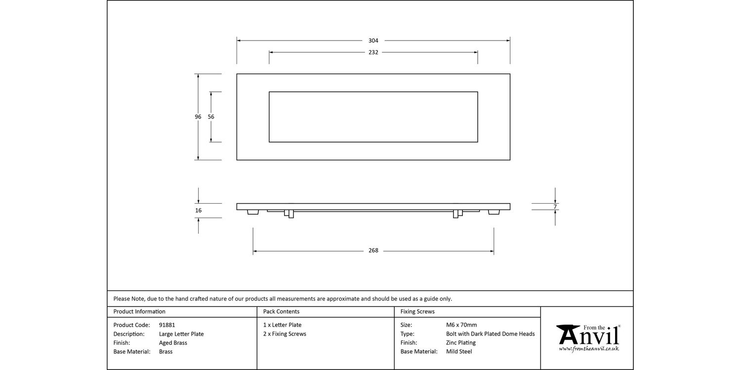 • Overall Size: 304mm x 96mm Opening Size: 232mm x 56mm Fixing Centres: 268mm Letterplate Thickness: 7mm