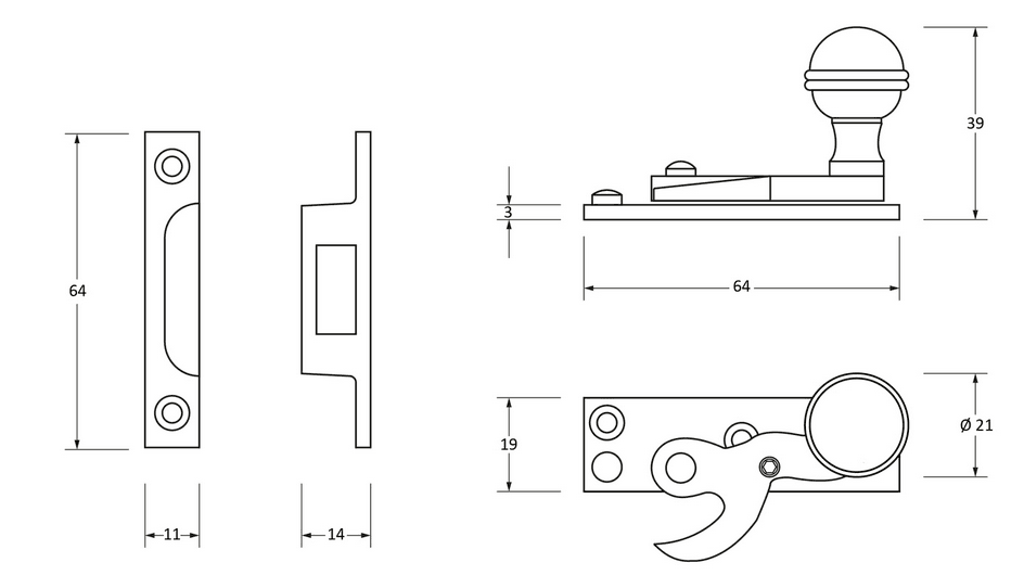A stylish knob hook fastener by From The Anvil used to secure your sash window. Ideal for use on a narrow top rail due to a thin fixing of the keep.